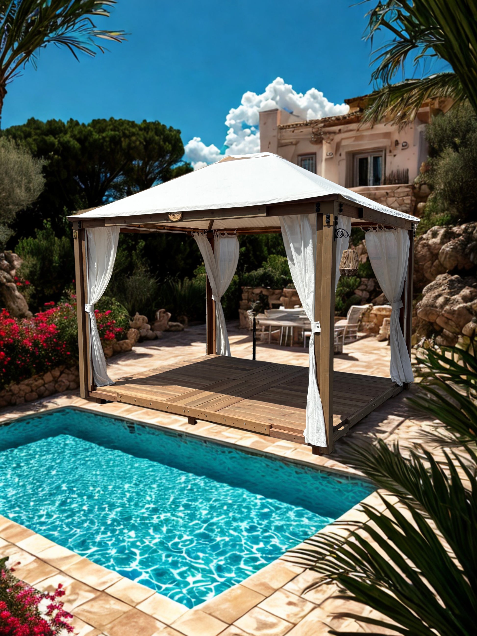 A sand-colored acrylic outdoor fabric canopy provides shade and comfort, blending both function and elegance.