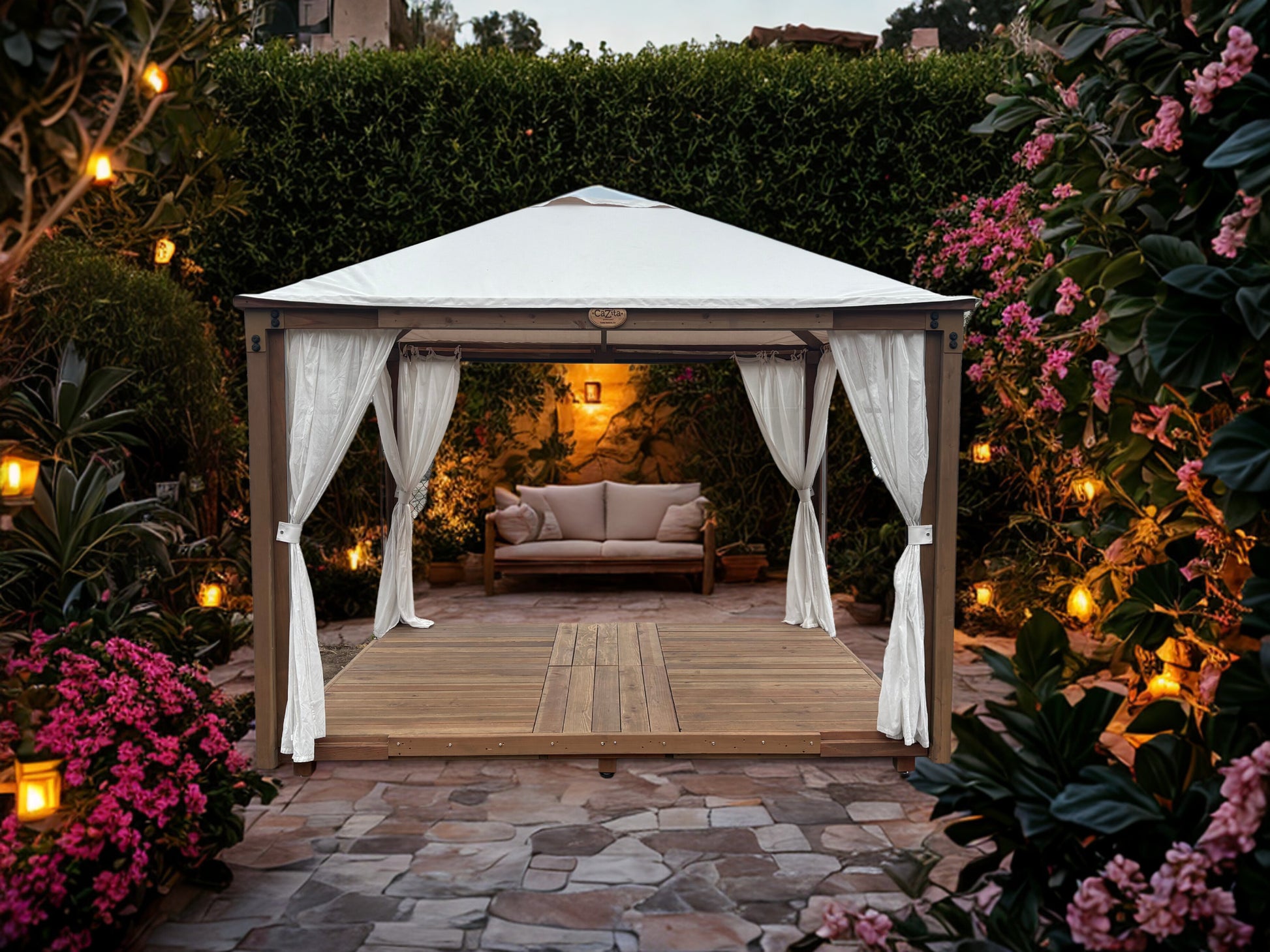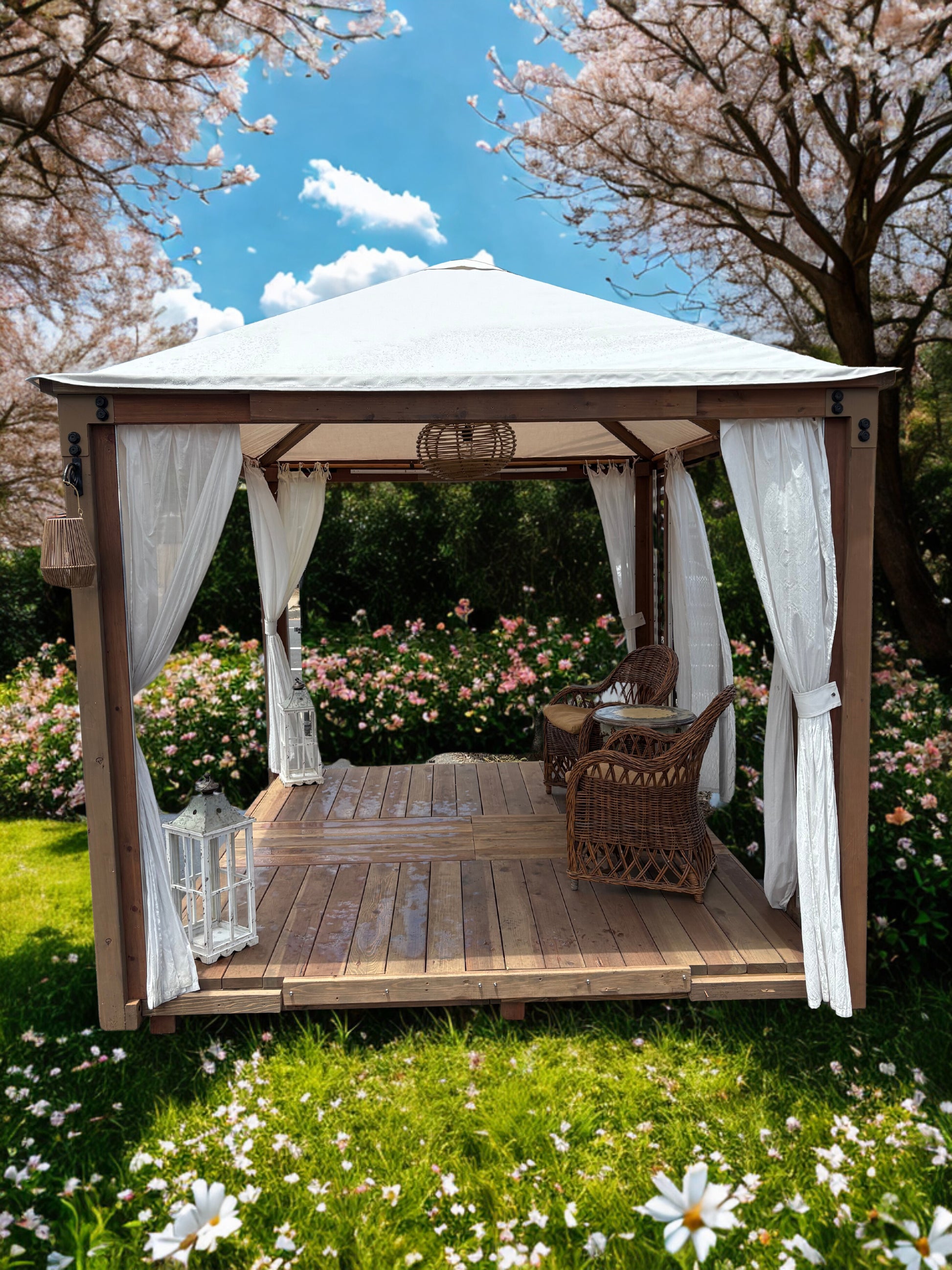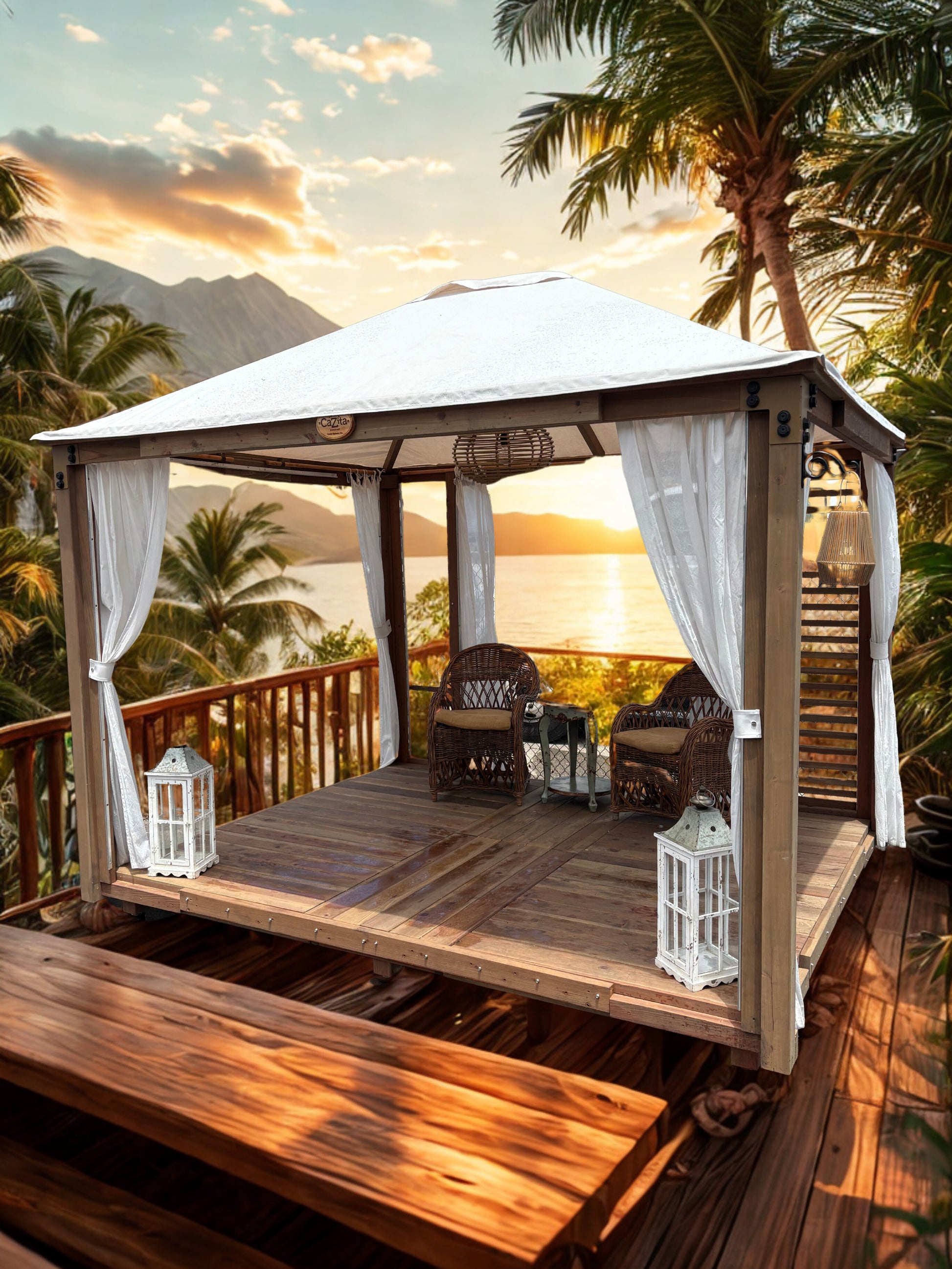 Included are sheer cotton drapes hung on wooden curtain rods. These drapes add a soft, airy aesthetic and are perfect for seasonal or decorative use. Please note: they are not treated for outdoor durability, but replacements are widely available in many colors and typically cost less than $20 per panel—perfect for refreshing your look throughout the year.