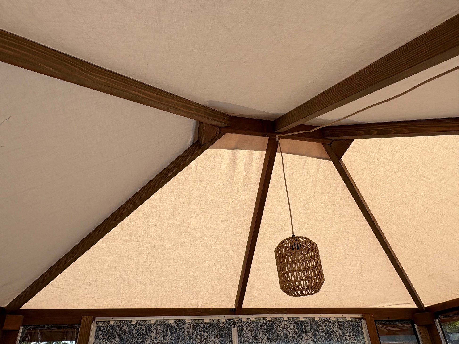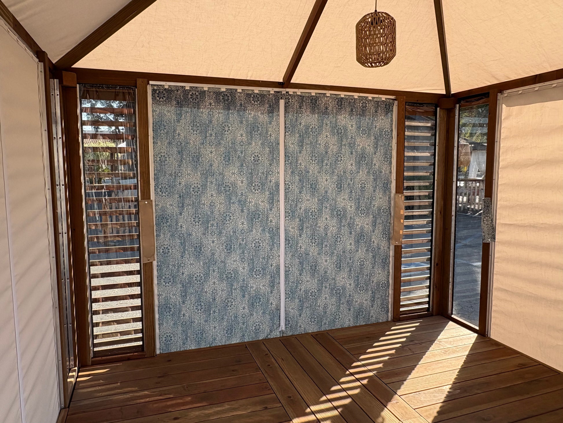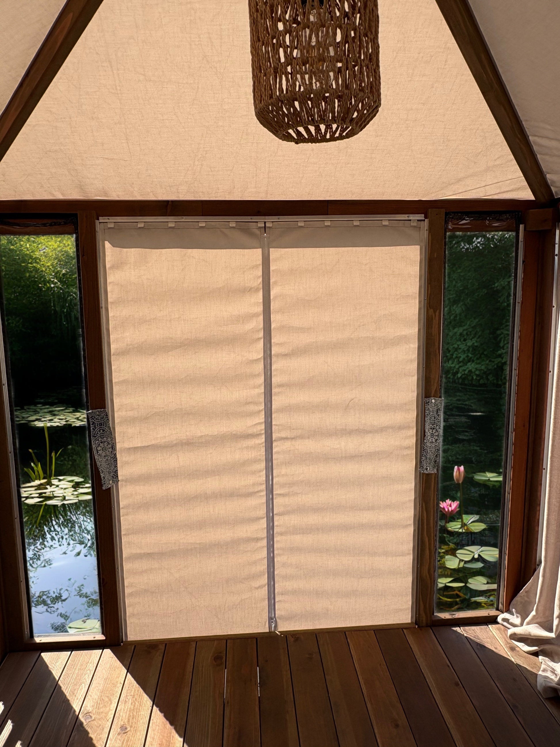 56" entrance sidewalls made from sand acrylic outdoor fabric, each with zippers and snaps